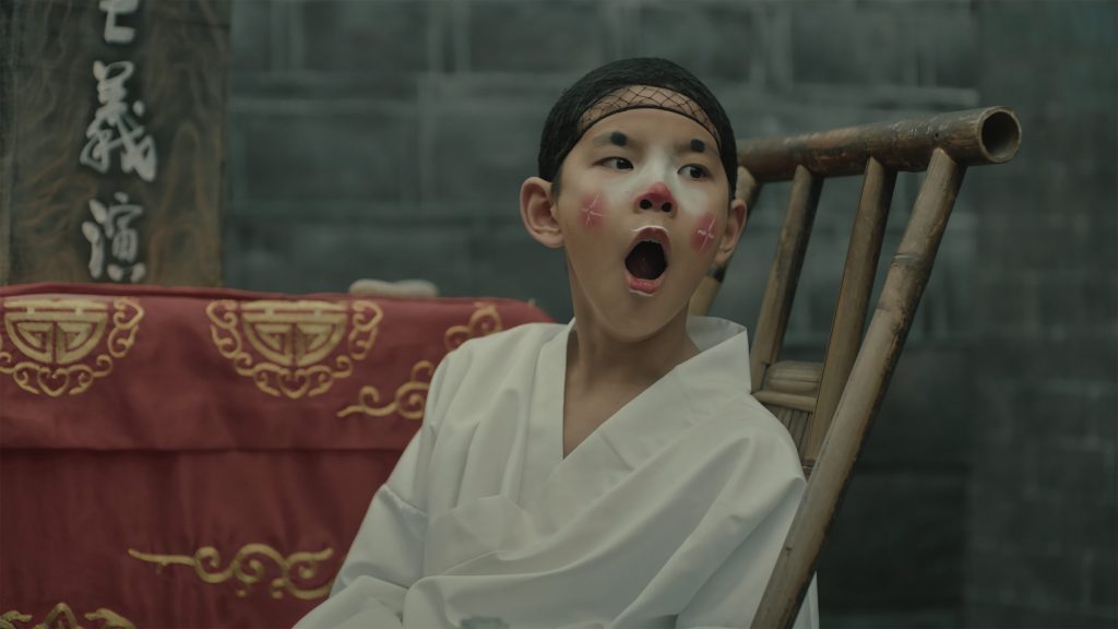 La plongée dans les souvenirs de cet acteur/clown, sur le point de franchir la Porte des Enfers, articule le récit, parti sur des bases chaotiques. Lors de son exposition, Jiongjiong Qiu multiplie les scènes improbables, absurdes qui retiennent l’attention tout en laissant pantois. Puis on comprend que le Vérolé, autour duquel gravite une bande d’e comédiens et de chanteurs, n’existe finalement que pour introduire un autre personnage, haut comme trois pommes, tenace et timoré à la fois, qui deviendra à son tour l’astre solaire. Au détour d’une conversation, le garçon impressionne par sa répartie et sa lucidité.