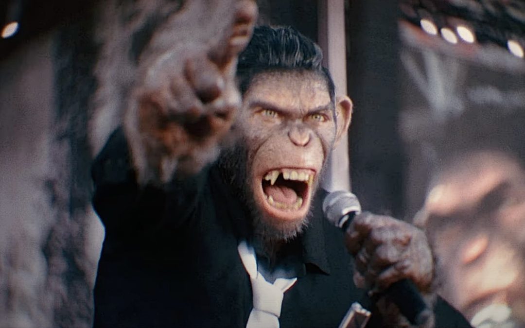 En fait, il est humain, avec des parents humains, mais il ressemble à un singe. Bref, on marche sur des œufs et cette faible innovation est loin d’être convaincante. Il y a bien quelque chose à retirer de cette idée. Robbie Williams a avoué dans une interview que l’industrie de la musique vous oblige soit à devenir un robot, soit à se muter en singe… et il a choisi son camp. Mais pourquoi un singe, maintenant ? Est-ce pour divertir le public ? Ou parce que sa personnalité se dégoûte au point de ne plus se sentir humaine ? Parce qu’un artiste se transforme en bête de foire ? Ou parce que certains préfèrent s’attacher au parcours d’un macaque plutôt qu’à celui d’un homme ?
