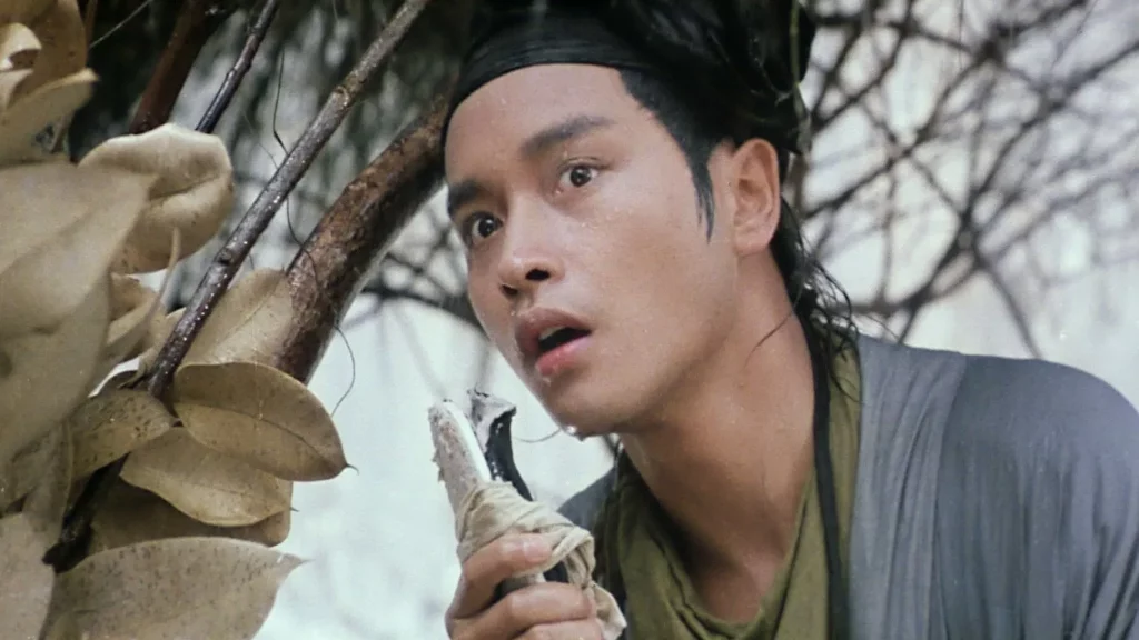 Ainsi, King Hu avait déjà utilisé ce postulat dans La Légende de la Montagne dont Tony Ching Siu-Tung s’inspire partiellement ici. D’ailleurs, son protagoniste Ning, lettré maladroit et ingénu, renvoie à celui de A Touch of Zen. Il perd son innocence dès qu’il rencontre un vagabond sabreur. Il est choqué par le massacre qui se déroule sous yeux, lui qui découvre toute la férocité d’une société qu’il ne perçoit que par les livres et les écrits. Cette naïveté touchante se combine au ridicule des situations, soutenant l’humour du dispositif. Tel le Grand Blond cher à pierre Richard, il échappe par chance aux menaces qui l’entourent, gags à l’appui (avec par exemple ce moment savoureux dans la cave, quand il extermine des morts-vivants involontairement).