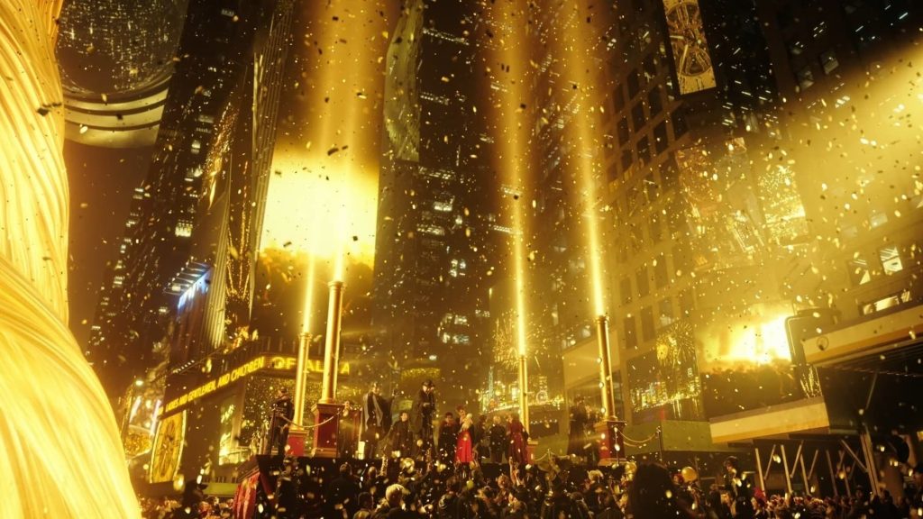 Par ailleurs, la mutation de New-York en Megalopolis, par le biais des artifices de l’architecture antique, renvoie toujours à la formule employée par Lang autrefois (qui mélangeait éléments mythologiques et bibliques dans l’optique d’empêcher l’effondrement de l’Allemagne, sous le joug alors des nazis). Megalopolis abrite en son sein tous les maux de notre siècle et met en exergue par ses lieux familiers, le fossé social, culturel et moral qui sépare les individus, le tout sous les strasses des paillettes ou des lumières rutilantes qui ne s’éteignent jamais.