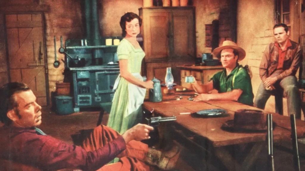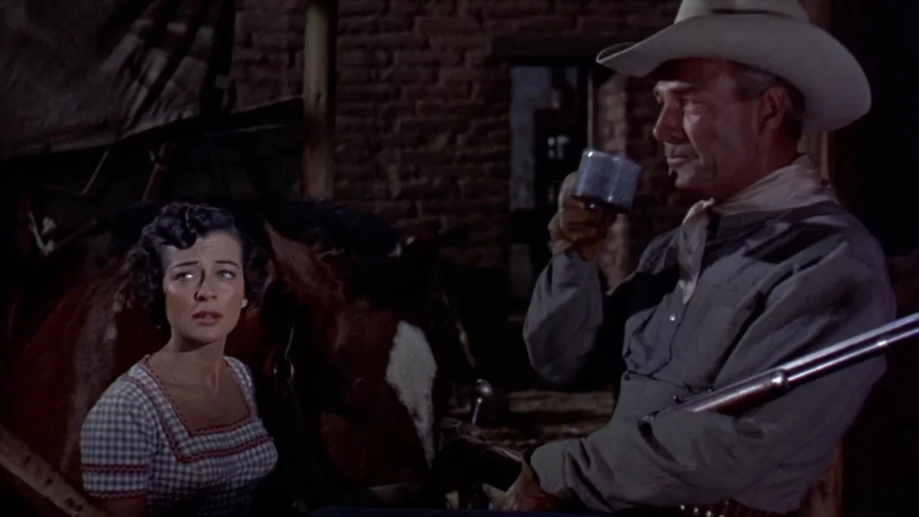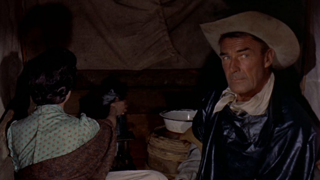 Auparavant, le réalisateur aura surtout impressionné dans sa gestion de l’intimité des personnages et des rapports amicaux ou hostiles qu’ils entretiennent. L’attirance d’Annie, femme mariée envers Ben, la rivalité cultivée entre ce dernier et Masters (campé par le futur Liberty Valance, Lee Marvin) ou la reconnaissance de John. Avec en point d’orgue, une veillée nocturne, alors que la tempête gronde à l’extérieur. La vérité, abordée de façon non littérale, refait surface et les sentiments affleurent. Les échanges entre un Ben alité sous le chariot et Annie, à l’intérieur du véhicule, séparés donc par une paroi boisée, émeuvent, générant une tendresse inattendue.